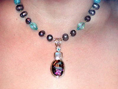 artisan-made pendant of blue topaz, dichroic class, opalite.