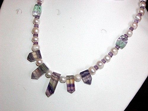 Striped fluorite, genuine freshwater pearls, fluorite beads, sterling silver beads and